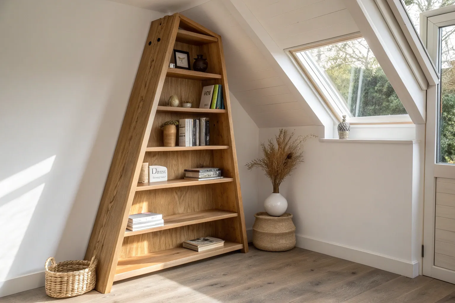 • Freestanding Oak Bookcase: Define your attic zones with this sturdy shelving unit that offers vertical storage without closing off the space totally.