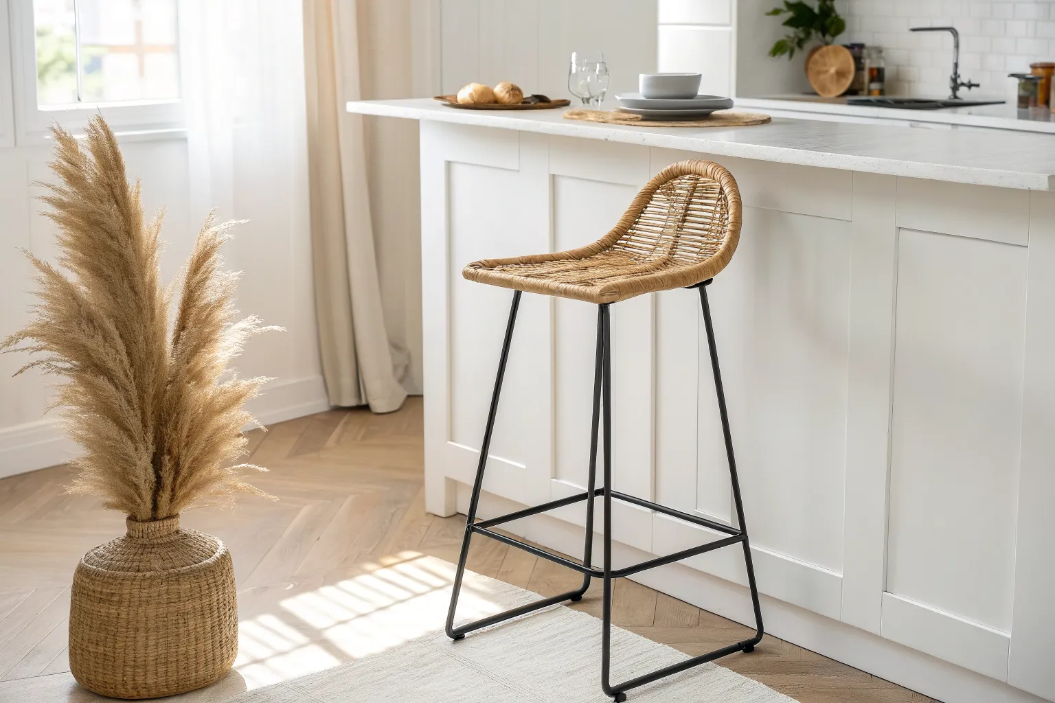 A white kitchen loves texture, and woven rattan stools bring that airy, relaxed vibe I keep coming back to. I’ve re-caned old seats before, and against white cabinets the pattern reads like subtle artwork.