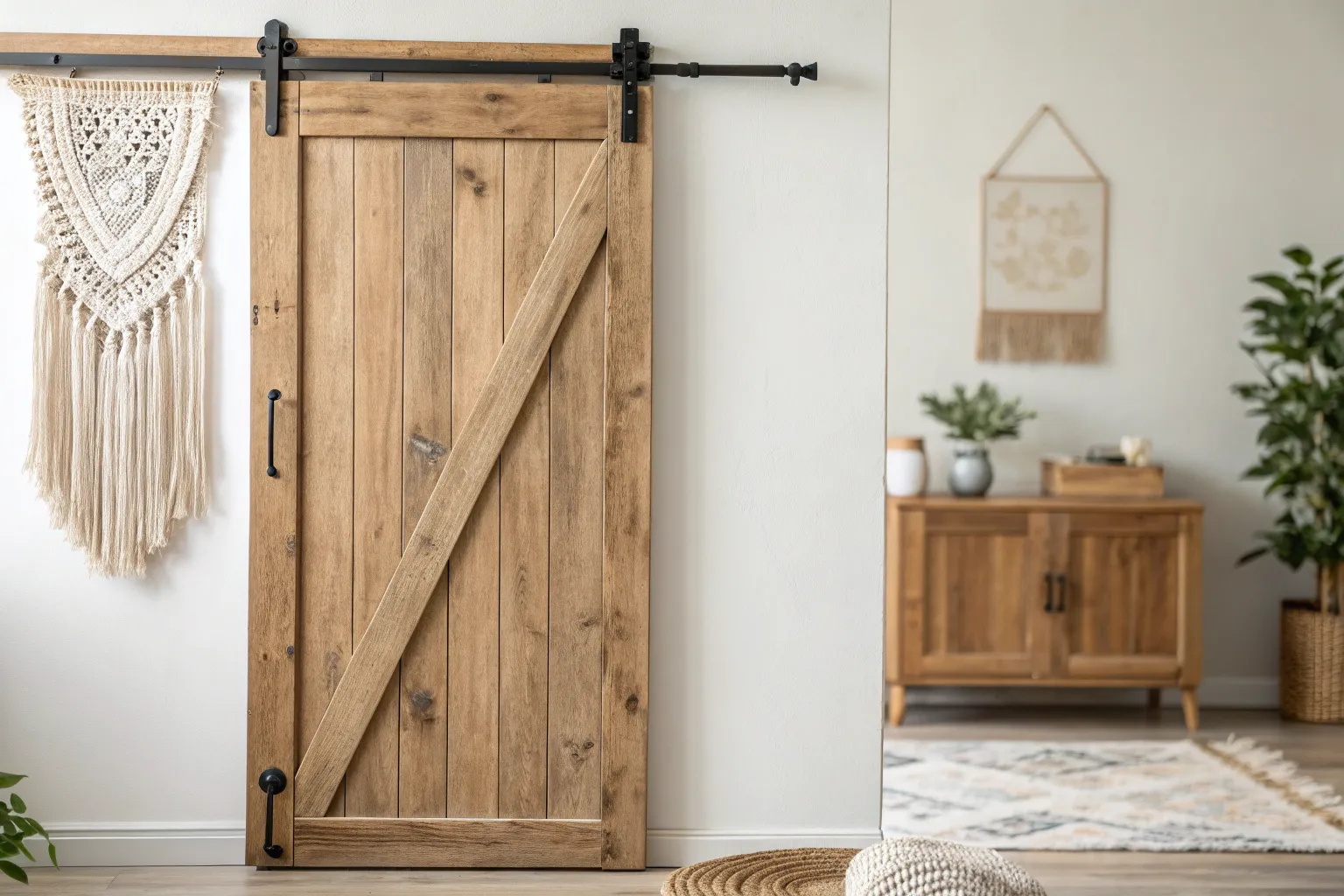 Classic X-brace sliding barn door—clean Scandinavian lines with warm, rustic wood grain.
