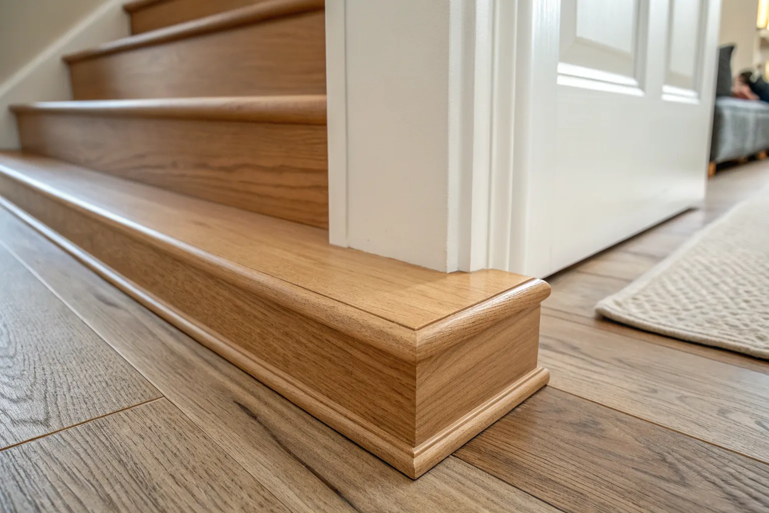 At the top of stairs, I like to “blend” the landing baseboard into the stair skirt board with a custom wedge so the flow feels continuous. The first time I tried it, it turned an awkward stair start into one of those details people point at and ask who did the trim.