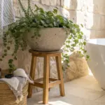 A petite round wooden pedestal table beside the tub—stable, serene, and handcrafted.