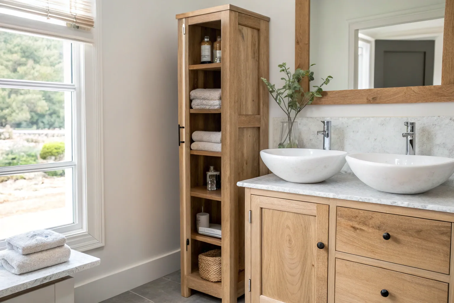 - Tall Oak Bathroom Cabinet: Upgrade your storage with a slender, wood-finish cabinet that perfectly matches airy, light-filled bathroom aesthetics.