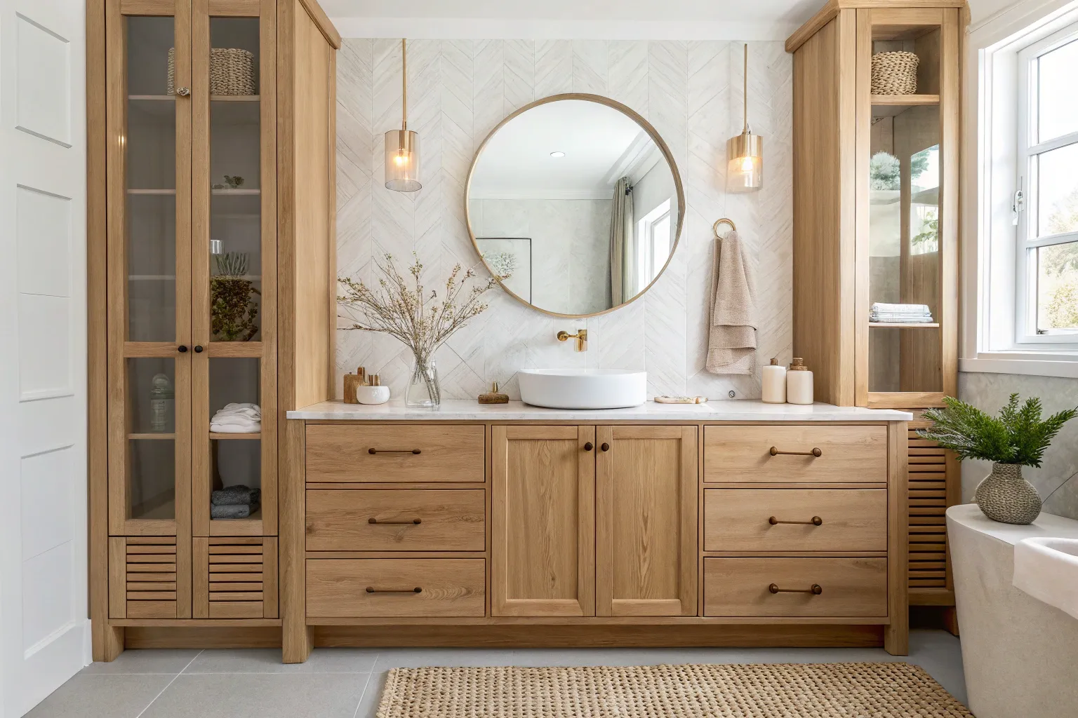 If you’re into that airy look, use glass-front upper cabinets for the stuff you don’t mind seeing, like rolled towels and jars. I’ve done this in my own bathroom and it nudged me to keep things curated instead of cramming.