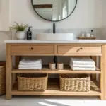 - Woven Seagrass Storage Basket: Organize your towels or toiletries stylishly underneath your tables with a natural woven seagrass storage basket.