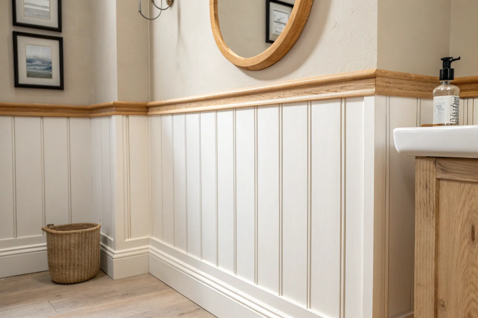 Try painted board and batten with a natural wood top rail for a warm mixed-material moment. I’ve done this with salvaged wood, and those little grain imperfections made the bathroom feel more lived-in and cozy.