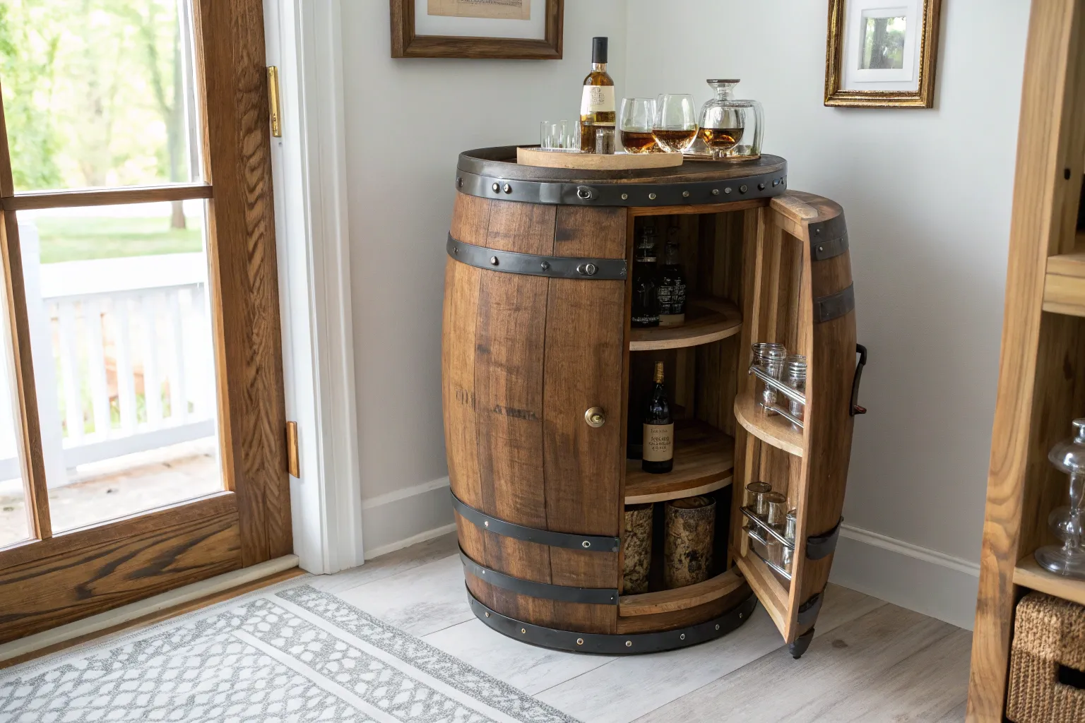 • Repurposed Wine or Whiskey Barrel Cabinet: Instantly add rustic charm to your home with a pre-made barrel cabinet featuring built-in shelving.