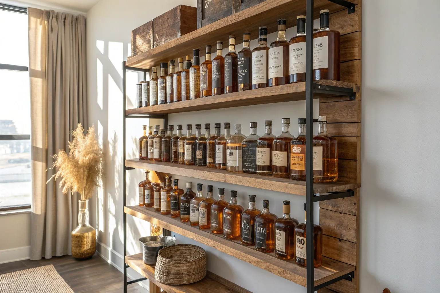 - Wall-Mounted Rustic Floating Shelves: Create a sturdy base for your bourbon collection with these rustic shelves that add instant industrial charm.