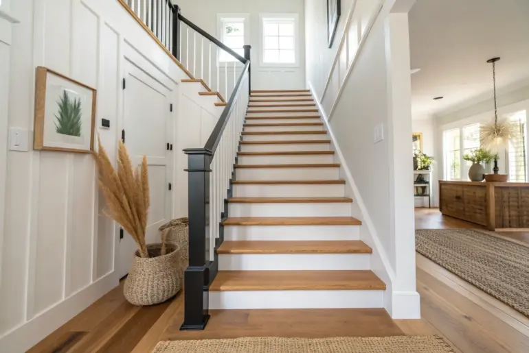 Carpet-free stairs can look just as finished and cozy as a runner—sometimes even more so—when the wood and details get a little love. I’ve redone a lot of bare staircases, and the sweet spot is always the same: make them beautiful, durable, and non-slip. Two-Tone With Dark Treads and Light Trim Deep walnut treads with crisp white trim—two-tone stairs that look dramatic and hide scuffs. If you want a little more drama, I’ve stained treads…