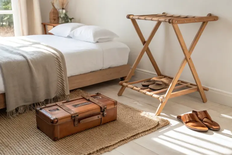 A good guest room luggage rack is one of those little touches that makes people feel instantly taken care of. I’ve built and styled a bunch of them over the years, and these ideas keep suitcases off the bed while making the room look pulled together. Fold-Flat Rack Stored Under the Bed A fold-flat wooden luggage rack that glides under the bed—perfect for tiny guest rooms. For tiny guest rooms, I always suggest a folding…