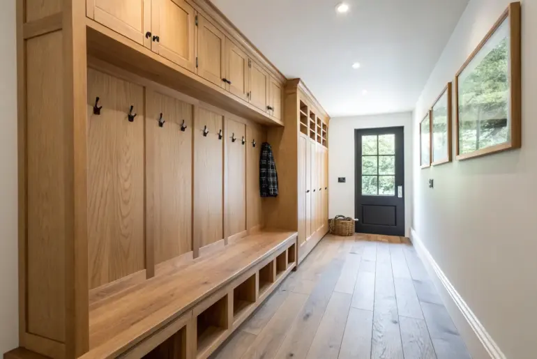 A long narrow mudroom can feel like a tricky hallway at first, but it’s actually the perfect place to go all-in on smart, hardworking storage. I’ve built a lot of these skinny “drop zones,” and a few simple woodworking moves can make them feel organized, cozy, and totally intentional. Continuous Upper Shelf With Baskets Continuous floating shelf + matching baskets: the chic, clutter-free upgrade for long narrow mudrooms. A long floating shelf up high with…
