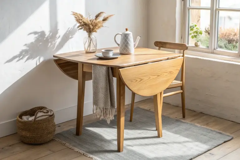 A small kitchen table can totally change how your kitchen feels—suddenly you’ve got a spot for coffee, homework, and quick meals without clogging up the walkway. Here are my favorite space-saving table ideas I’ve built (and rebuilt) over the years when every inch matters. Drop-Leaf Table for Flexible Seating A tiny drop-leaf table that opens up fast—perfect for narrow kitchens and surprise guests. I love a classic drop-leaf table because you can keep it tiny…