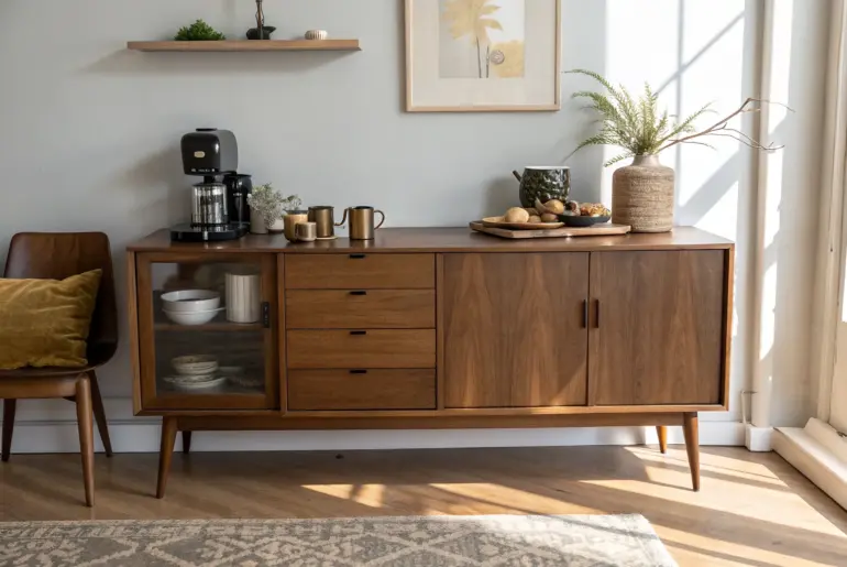 A good mid-century modern coffee bar has that warm wood vibe, clean lines, and just the right amount of retro charm. Credenza Coffee Bar With Tapered Legs Mid-century credenza coffee bar with tapered legs—warm wood, simple tray, daily brew essentials. My favorite classic move is turning a low mid-century modern credenza into a coffee bar, because the long silhouette and tapered legs instantly nail the era. I’ve refinished a few in warm, satin wood tones…