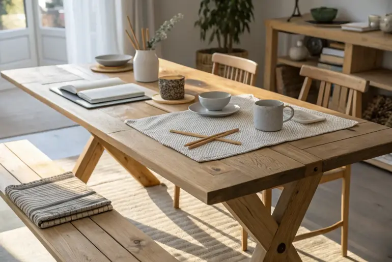 If your dining room is pulling double duty as a classroom, you can absolutely make it work without turning your whole house into a supply closet. Add Bench Seating That Tucks In Space-saving bench seating that tucks under the table—beautiful, practical, kid-friendly flow. I love bench seating in a homeschool dining room because you can slide it fully under the table and reclaim your walkway in seconds. I’ve made benches with a slightly narrower seat…
