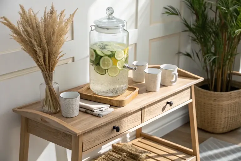 A good drinks table keeps guests mingling, cups filled, and cleanup easy. I’m sharing my favorite setups I’ve built in my shop—starting with classic crowd-pleasers and ending with a few “how is that a drinks table?” surprises. Slim Console Table Drink Lineup A slim oak console keeps drinks in a clear lineup—wood tags make serving effortless. For bigger gatherings, I use a narrow console drinks table and set drinks in a tidy line—water, tea, then…