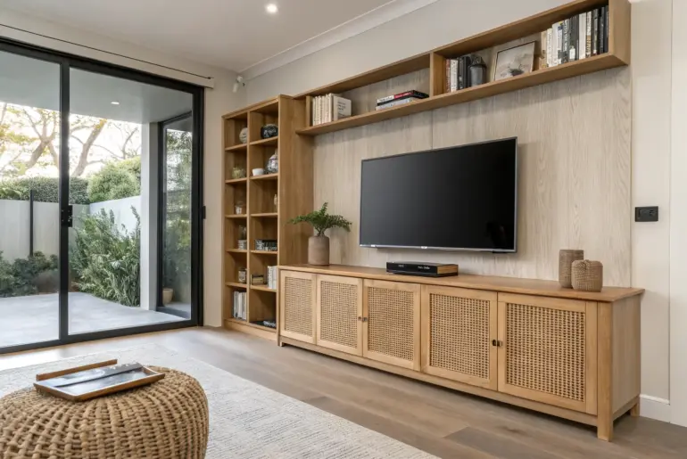 A great home theater setup feels even better when the screen and gear look intentional instead of like an afterthought. These home theater cabinet ideas focus on smart storage, clean cable control, and wood details that make your movie wall feel custom. Rolling Cabinet Base for Flexible Seating Light oak home theater console on hidden locking casters—flexible seating, clean Scandinavian style. In multi-use rooms, I’ve built a sturdy console on hidden locking casters so the…