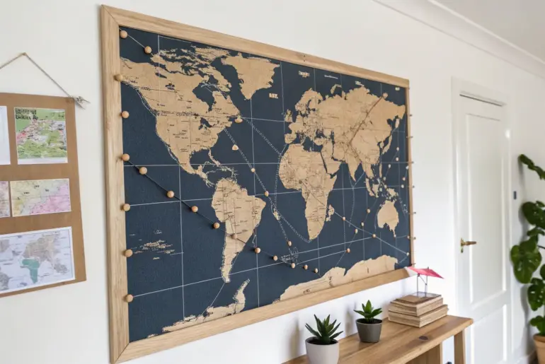 A world map bulletin board is one of those pieces that instantly makes a space feel curious, collected, and alive. Photo-and-String “Where We’re From” Map A photo-and-string world map board that beautifully connects faces to their roots. I once made a world map bulletin board for a community group where everyone pinned a small photo and ran yarn lines to their place of origin. If you try it, keep a little bowl of extra pins…
