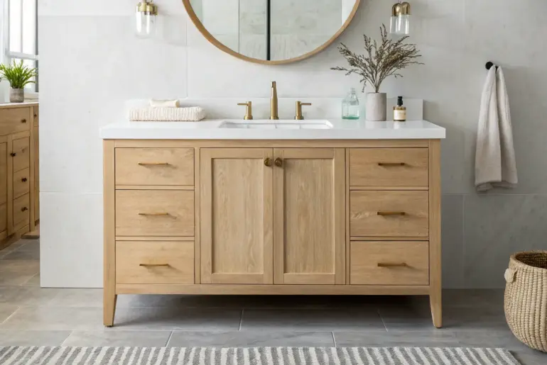 Oak cabinets can look wildly fresh in a bathroom when you style around the wood instead of fighting it. I’ve updated everything from honey oak vanities to pale white oak builds, and the right mix of color, hardware, and texture makes the whole room click. Black-Framed Rectangle Mirrors Light oak vanity + slim black rectangle mirror—simple contrast that makes the whole wall feel finished. Pairing oak cabinets with black-framed mirrors ties in darker accents so…