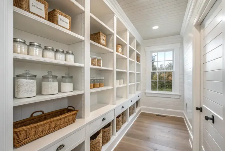 A pantry can be way more than a place to stash boxes—it can be your favorite little “shop” inside the house if you design it right. Floor-to-Ceiling Storage Zones Go vertical: a slim wooden step stool makes ceiling-high pantry storage easy and beautiful. When I design a pantry, I push storage all the way up and reserve the top for backstock, because vertical storage is basically free square footage. I keep a slim wood step…
