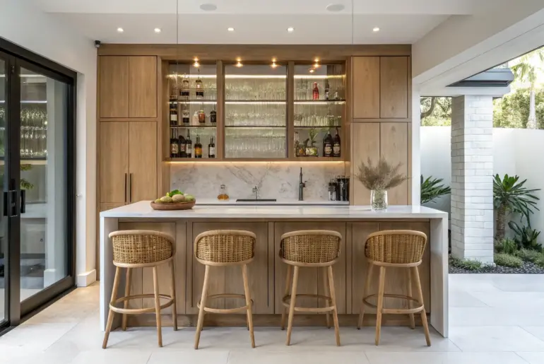 A modern home bar is really just a tiny destination—one part smart storage, one part atmosphere, and a whole lot of personality. Here are my go-to modern bar design ideas I’ve used (and loved) in my own builds, especially when wood is the star. Slim Metal Foot Rail Detail Slim metal foot rail on a light oak bar—small detail that instantly elevates the cocktail vibe. A simple metal foot rail makes a home bar feel…