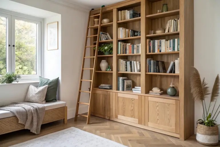 If you’ve ever wished your apartment had a “real” library, you’re in the right place. I’ve built book storage in tight rentals and tiny corners, and it’s amazing how a few smart wood shelves can make your whole home feel cozier. Window Seat Library Nook A reclaimed-wood window seat library nook with drawers—bright, cozy, and craft-forward. One of my favorite builds is an apartment library window bench with bookcases flanking the sides and deep drawers…