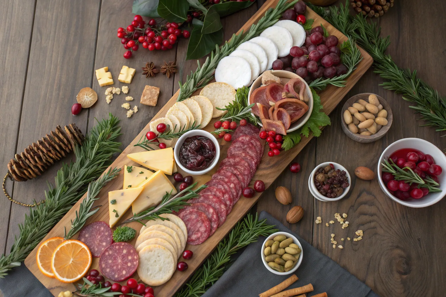 - Large Acacia Wood Serving Board: Establish your festive foundation with a sturdy, long wooden charcuterie board that highlights food with beautiful natural grain.