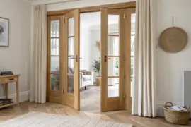 Natural oak grain warms a minimalist living room instantly—simple, cozy, never sterile.