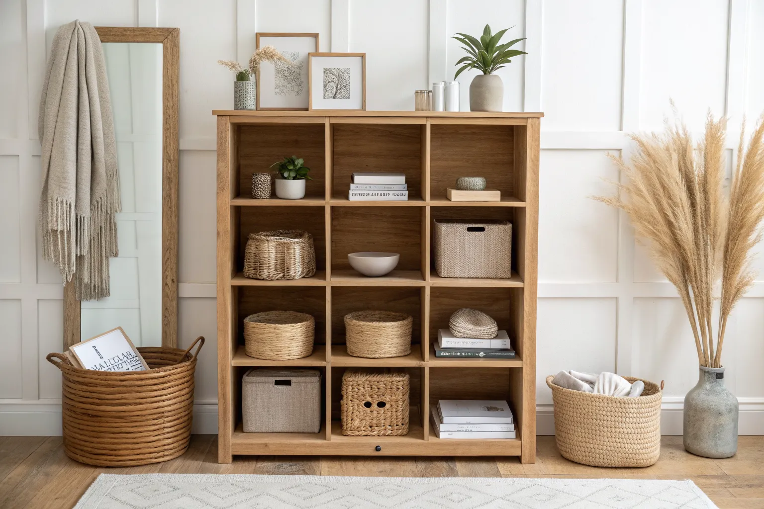 - Neutral Linen Throw Blankets: Soften the look of wooden cubbies by draping a neutral, fringed throw blanket nearby for instant texture.