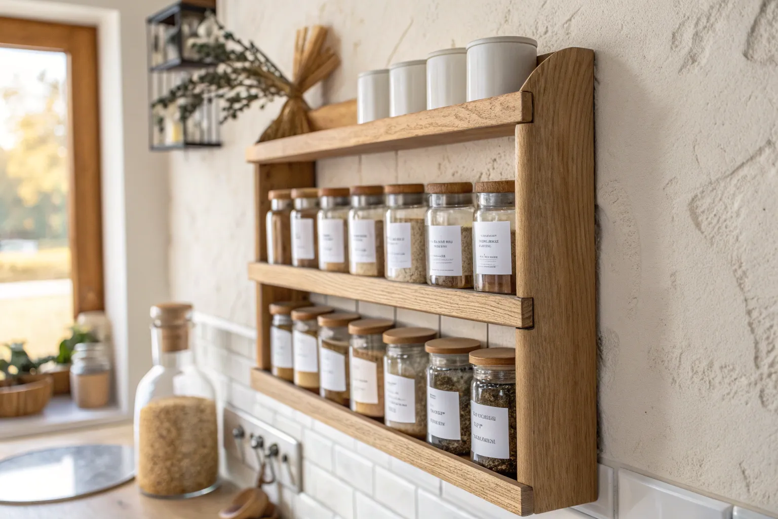 I love a rail-style spice rack with small shelves that hang from hooks, because you can slide things around like a mini gallery wall. The first time I built one, adding a dowel safety bar on each shelf made it sturdy enough for daily grabbing.