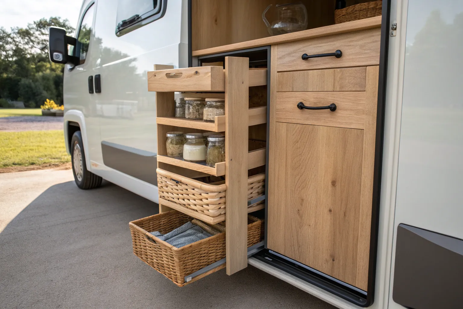 Friction-slide pantry pullout: smooth access, stays shut on the road—no surprise openings.
