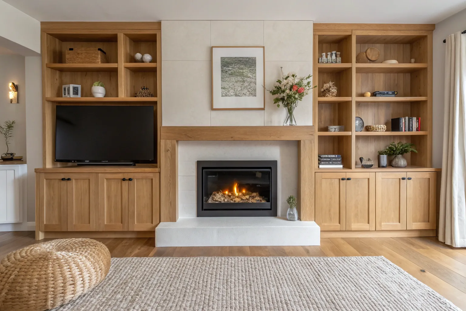 I love building base cabinets on either side of the fireplace wall because they hide cords, games, and all the not-so-pretty stuff. In my own living room, that closed storage is what finally made the TV-and-fireplace zone feel calm instead of cluttered.