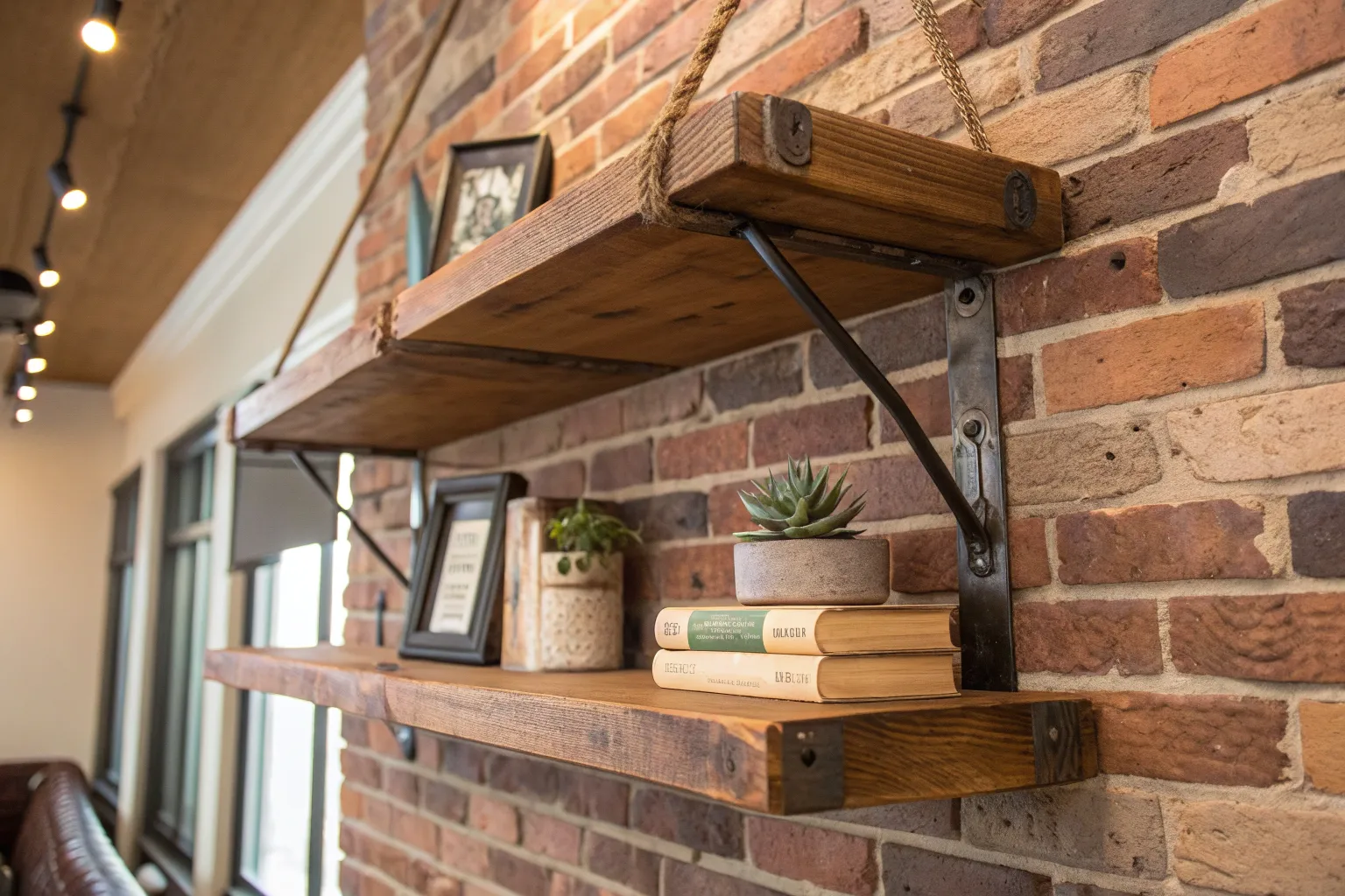 Suspended shelves give a floating illusion with a touch of rustic charm. I used thick ropes to hang wooden planks in my studio, creating a unique display area.