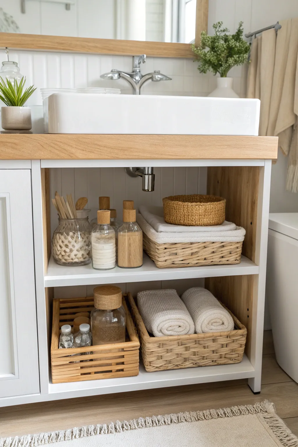 - Stackable Storage Baskets: Organize your essentials neatly with stackable baskets that fit seamlessly around plumbing fixtures.