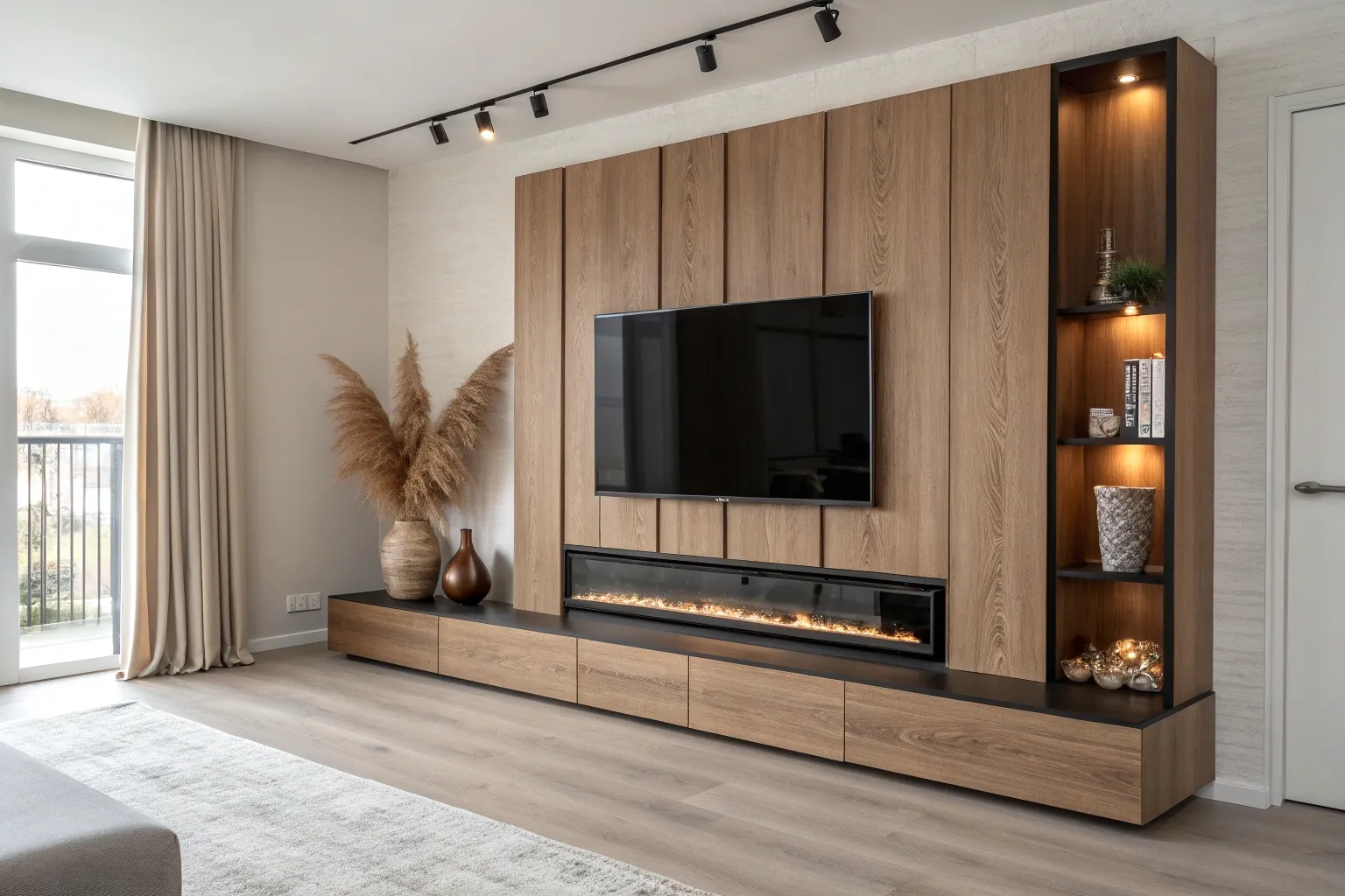 • Wall-Mounted Electric Fireplace Insert: Create a cozy focal point beneath your TV or sliding panel with this sleek, modern electric heating solution.