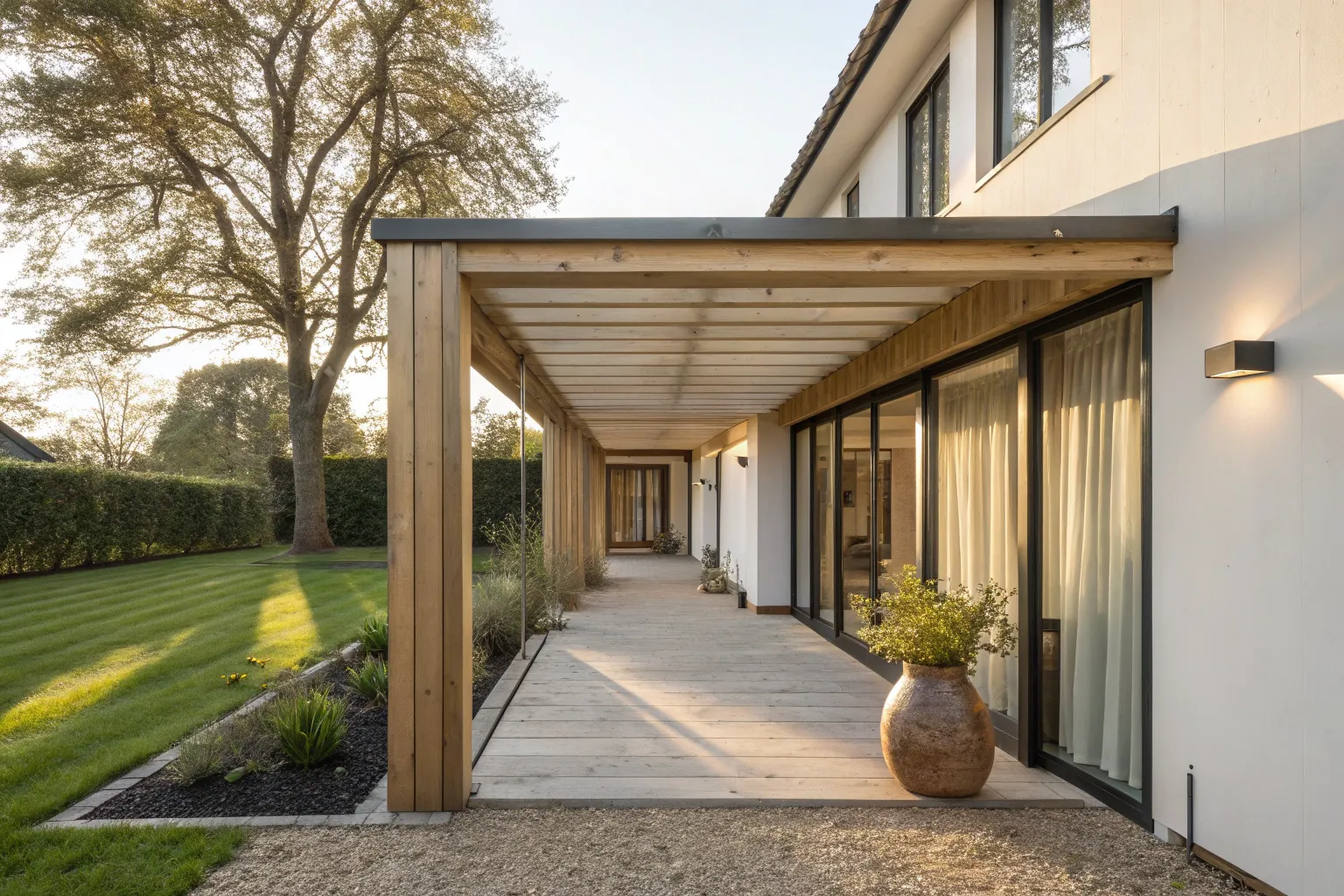 Clean shed-roof connector in stained timber—minimal lines, warm wood, and modern shelter.