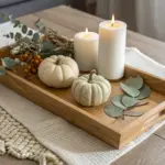 On my end table, I start with a wood tray and cluster pillar candles in two heights, then tuck in evergreen sprigs and a few pinecones. I’ve found this setup stays tidy all season, and it instantly makes the corner feel warm at night.