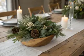 For a clean end table moment, I place two white candles on a birch wood slice with just one eucalyptus sprig. I do this when I’m craving calm Christmas vibes, and the pale wood grain keeps it cozy without feeling busy.