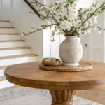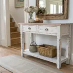 For that cozy farmhouse feel, I like a lightly distressed entry chest with a simple wreath, a crock-style vase, and a stack of worn books. I’ve aged finishes with sanding blocks on corners and edges, and it always makes the piece feel like it belongs.