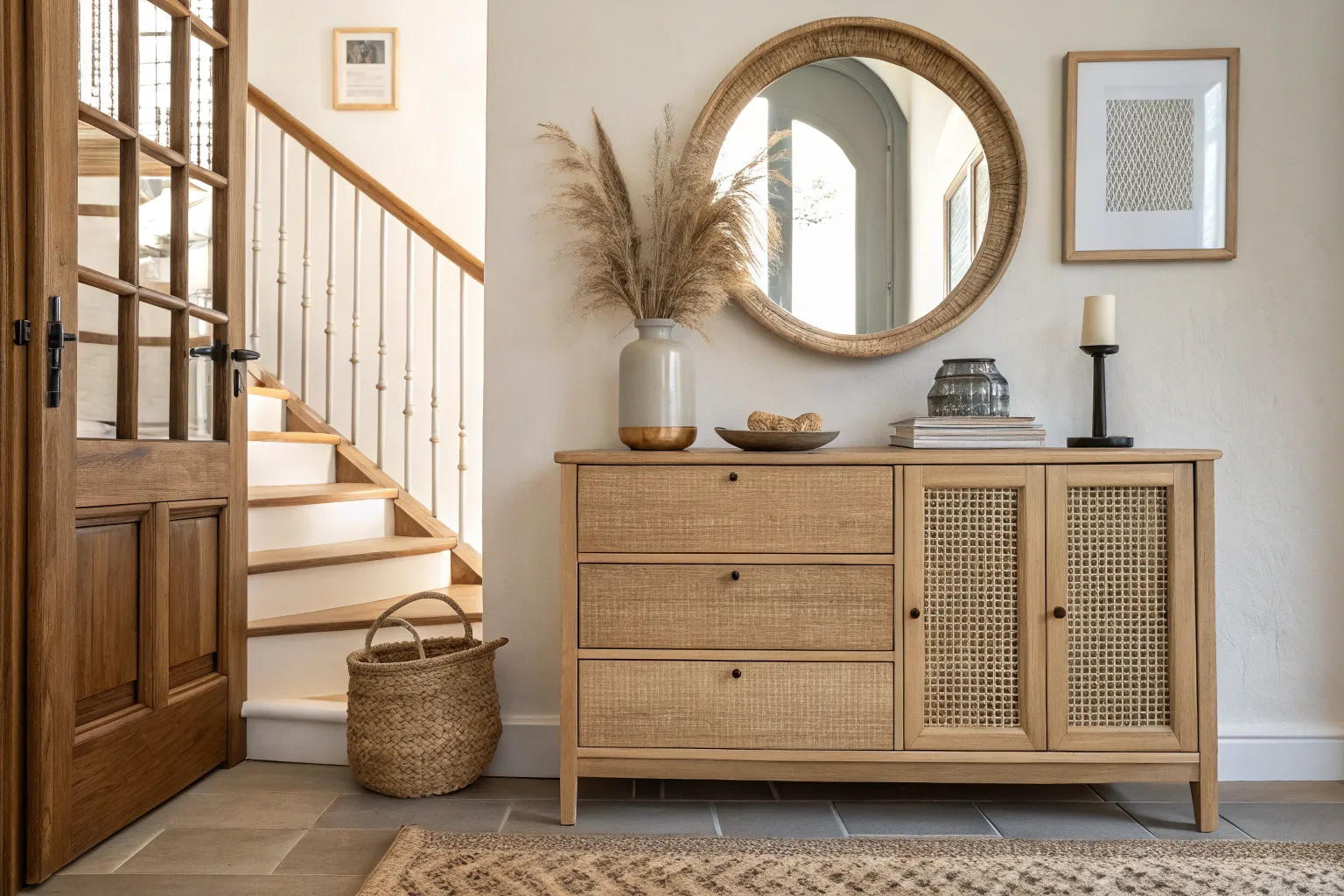 My most-used formula is a warm wood entryway chest with a big statement mirror above it and a soft table lamp on one side. I do this in my own place whenever the entry starts feeling “blah,” because it instantly adds height, light, and polish.
