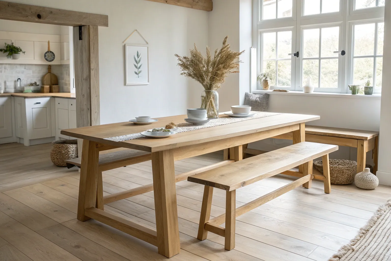 - Modern Minimalist Wooden Dining Table: Create a welcoming gathering spot with a simple wooden table that perfectly complements abundant natural light.