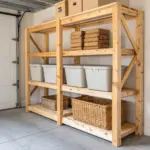 Vertical farmhouse order: tall wooden shelving with labeled bins—no more mystery bolts.