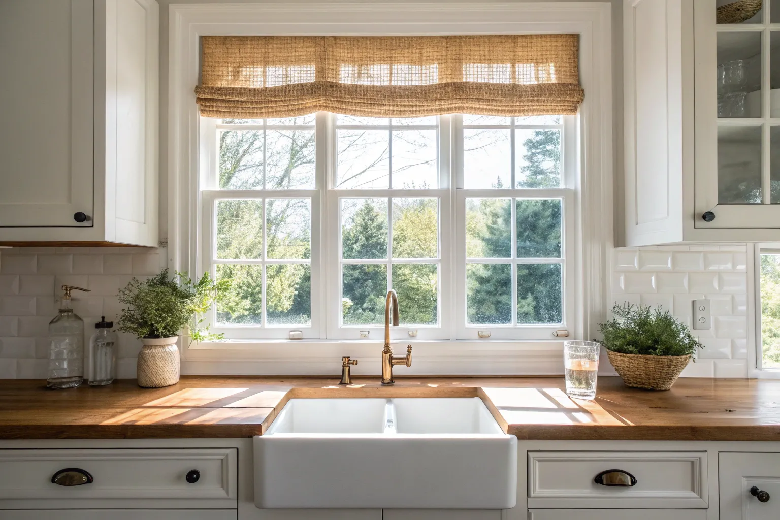 A woven wood shade adds instant texture to a farmhouse kitchen window while still keeping things neutral and airy.