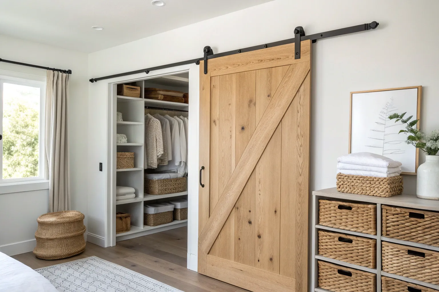 A sliding barn door is a classic farmhouse move, and I love it for walk-in closets because it saves swing space and adds instant character. I’ve built a few from reclaimed boards, and the nail holes and knots are honestly the best part.