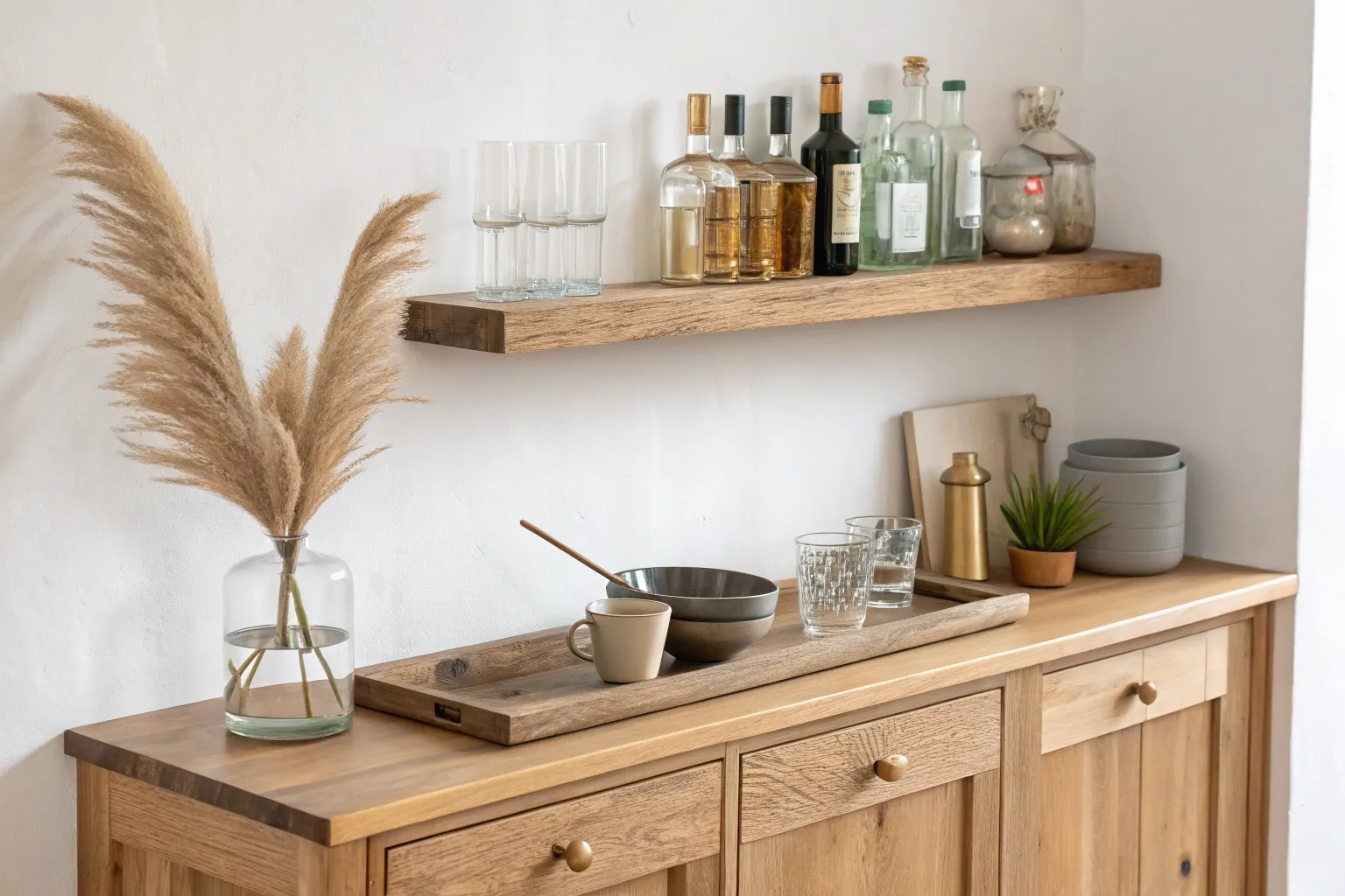 One of my most-used setups is a floating shelf bar installed above a sideboard for bottles up top and tools below. I always match the shelf wood tone to the furniture so the whole wall reads as one “bar moment.”