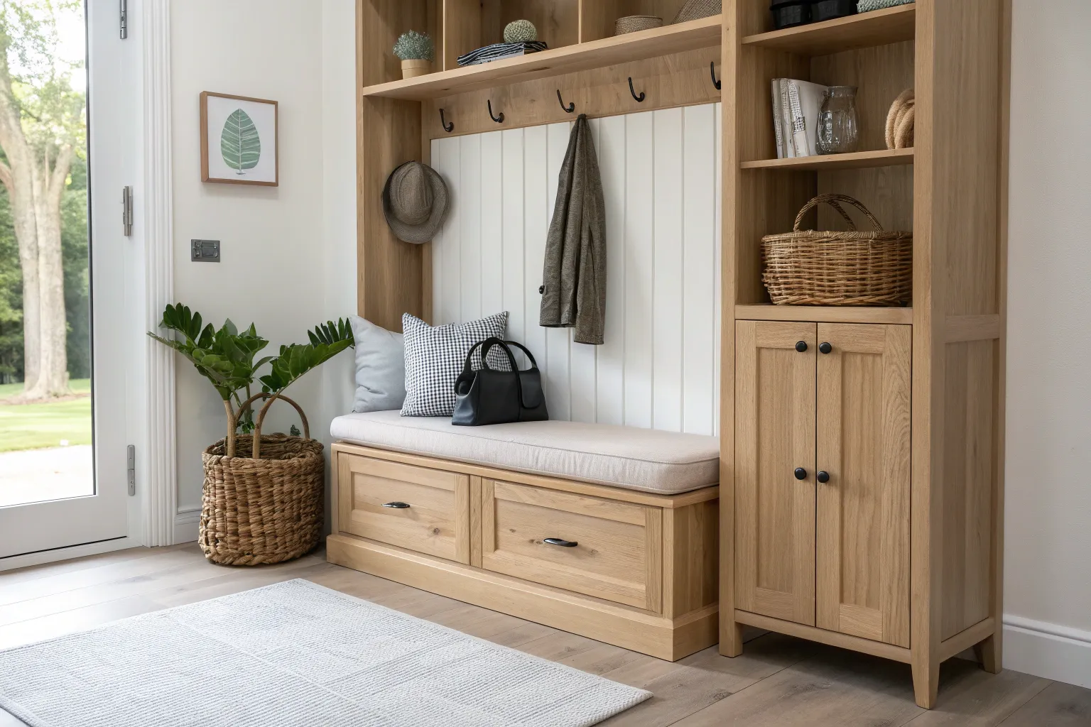 - Woven Storage Baskets: Use these natural baskets in upper cubbies to hide clutter and bring organic warmth to your entryway mudroom.