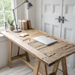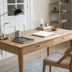 • Mount slim wood shelves above the table; the vertical line of shelving reinforces the mental boundary of “workspace.”