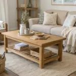 • Living area: coffee table, media console, or low oak credenza.