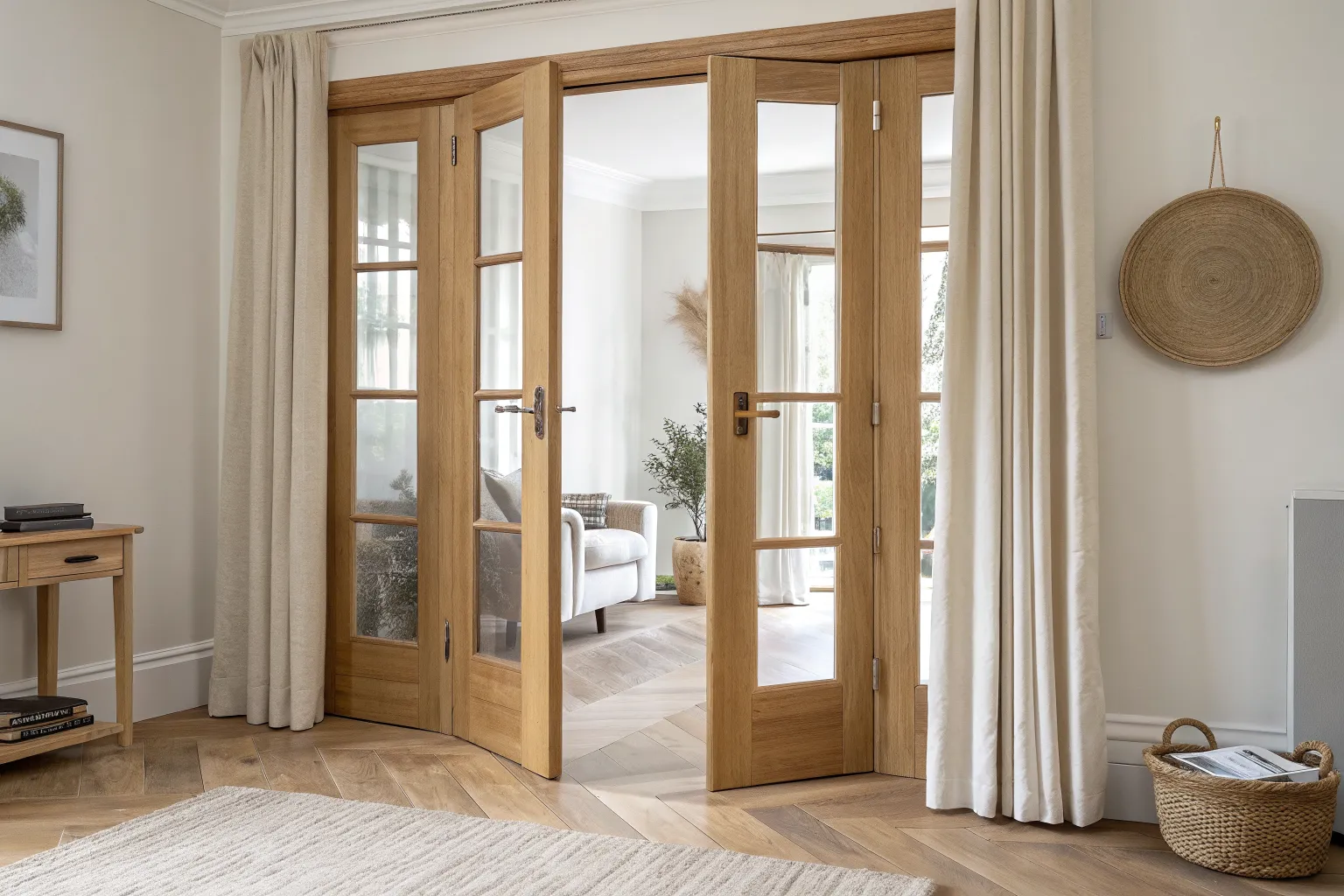 Pocket French doors in natural oak: elegant glass panels that glide away to free up floor space.