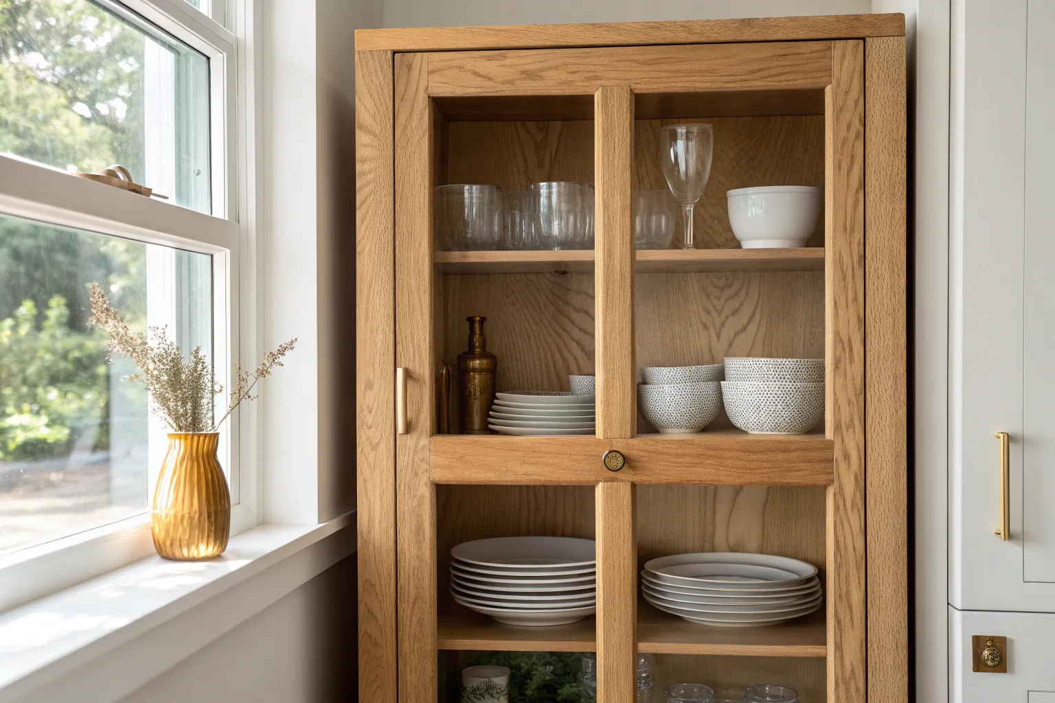 • Light Oak Display Cabinet with Glass Doors: Showcase your organized drinkware while keeping dust away with a beautiful, light wood display cabinet featuring glass doors.