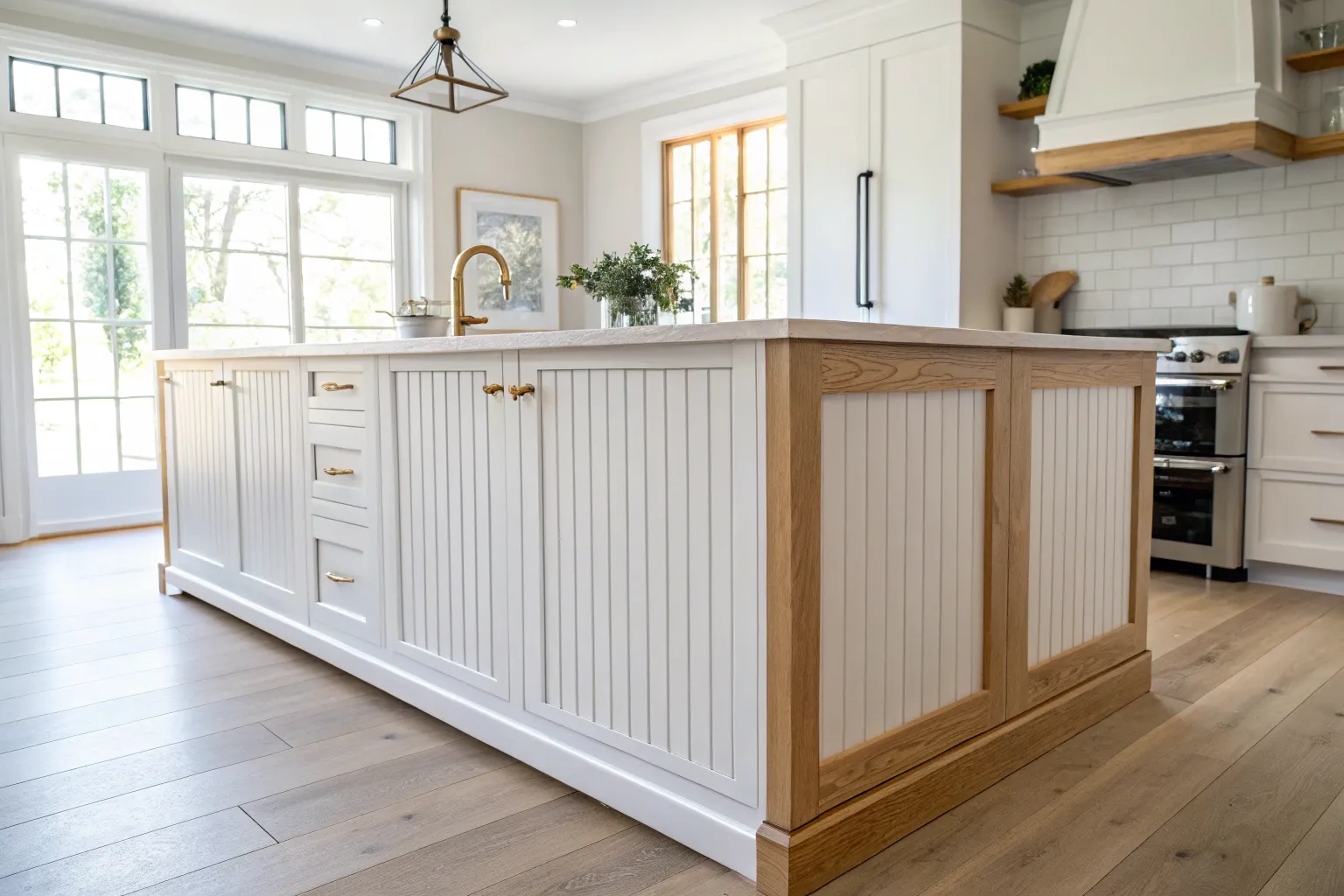 A simple shiplap wrap on the back of the island gives that cozy farmhouse texture without getting too fussy. I like using thin tongue-and-groove boards because I’ve found they stay flatter and look cleaner at the seams.