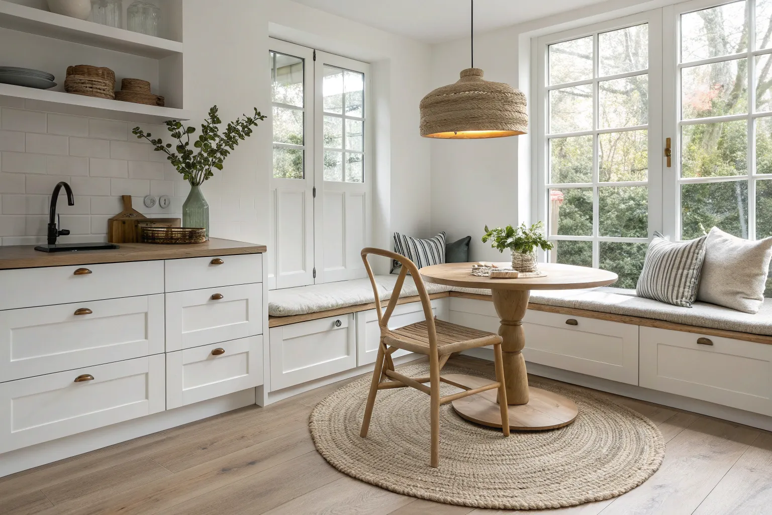 A warm pendant light centered over the breakfast nook table makes the whole corner feel like a destination, not an afterthought. I always install it on a dimmer because bright “task lighting” and cozy “second cup of coffee” lighting are two very different moods.